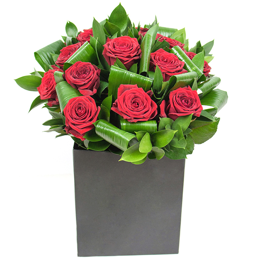 Enhance your space with our Charming Red Rose Arrangement. This exquisite bouquet features rich red roses paired with vibrant aspidistra leaves and graceful ruscus, crafted to add elegance and style to any setting.